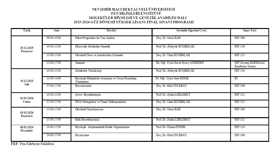 FBE 2025-2026 Eğitim-Öğretim Yılı Güz Yarıyılı Final Sınav Takvimi
